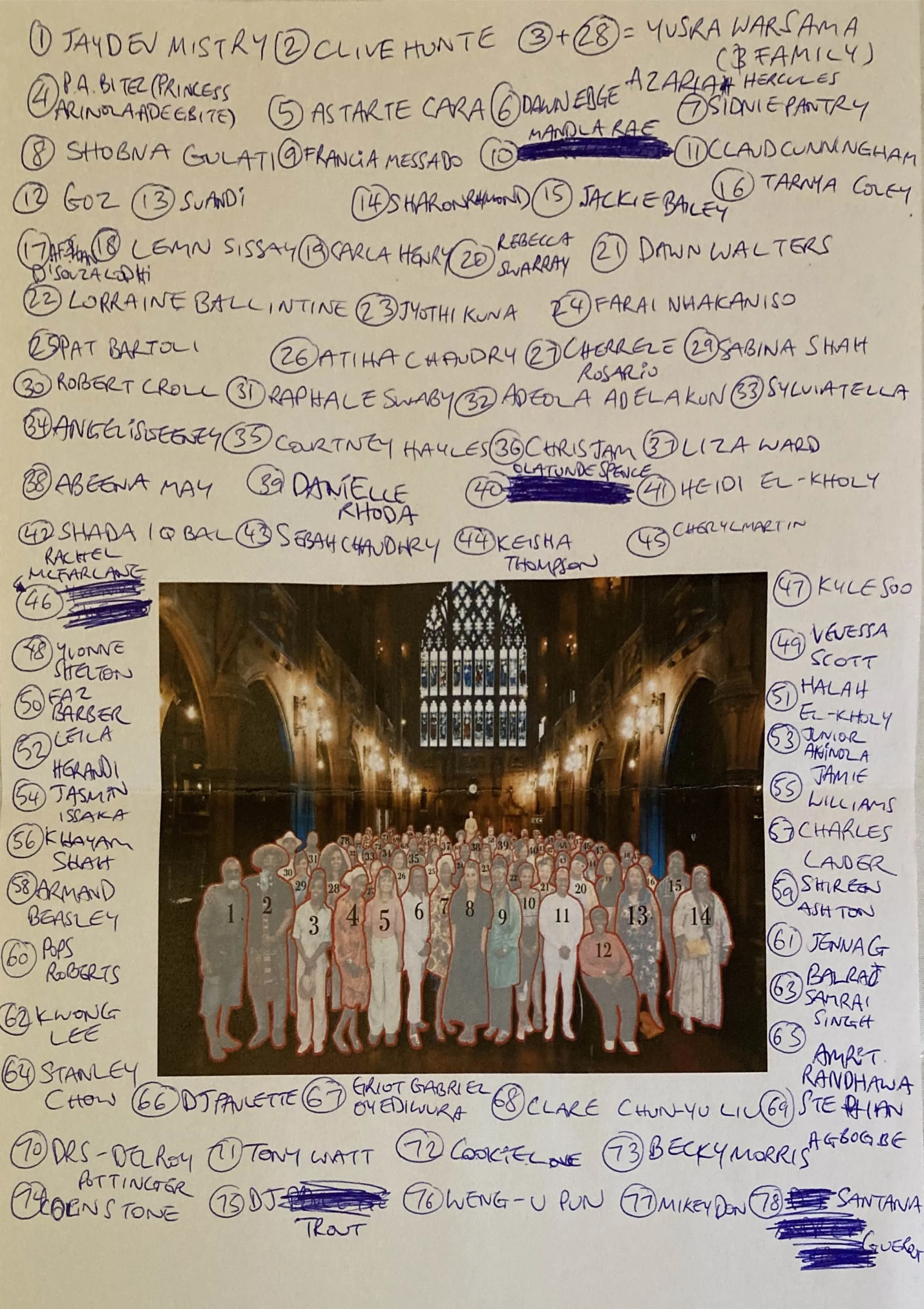 On 18th July I replicated the disappeared photograph taken at The British Pop Archive but this time I included people of colour: Music producers, international DJs, theatre producers, nationally renown artists, actors and chart topping singers, fashion designers, photographers, poets and novelists, all from the North West of England. Priti Shikotra is the photographer and here is the photograph