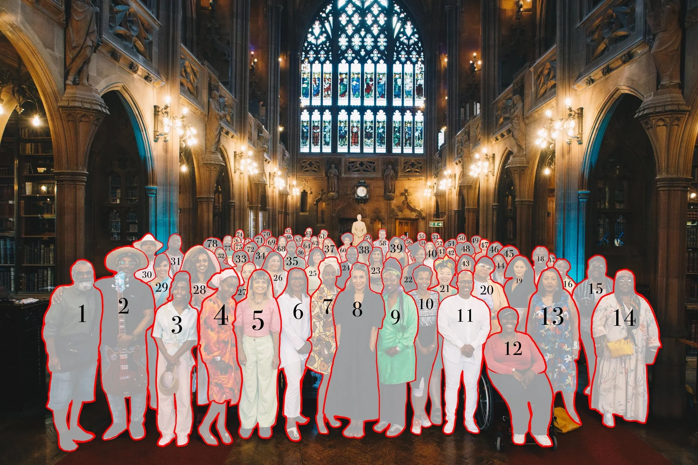 Some beautiful minds of black and brown creatives in Manchester taken on July 18th 2022 at John Rylands as a response to the disappered photo taken on May 20th in the same spot for the launch of The British Pop Archive.