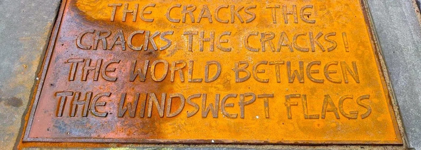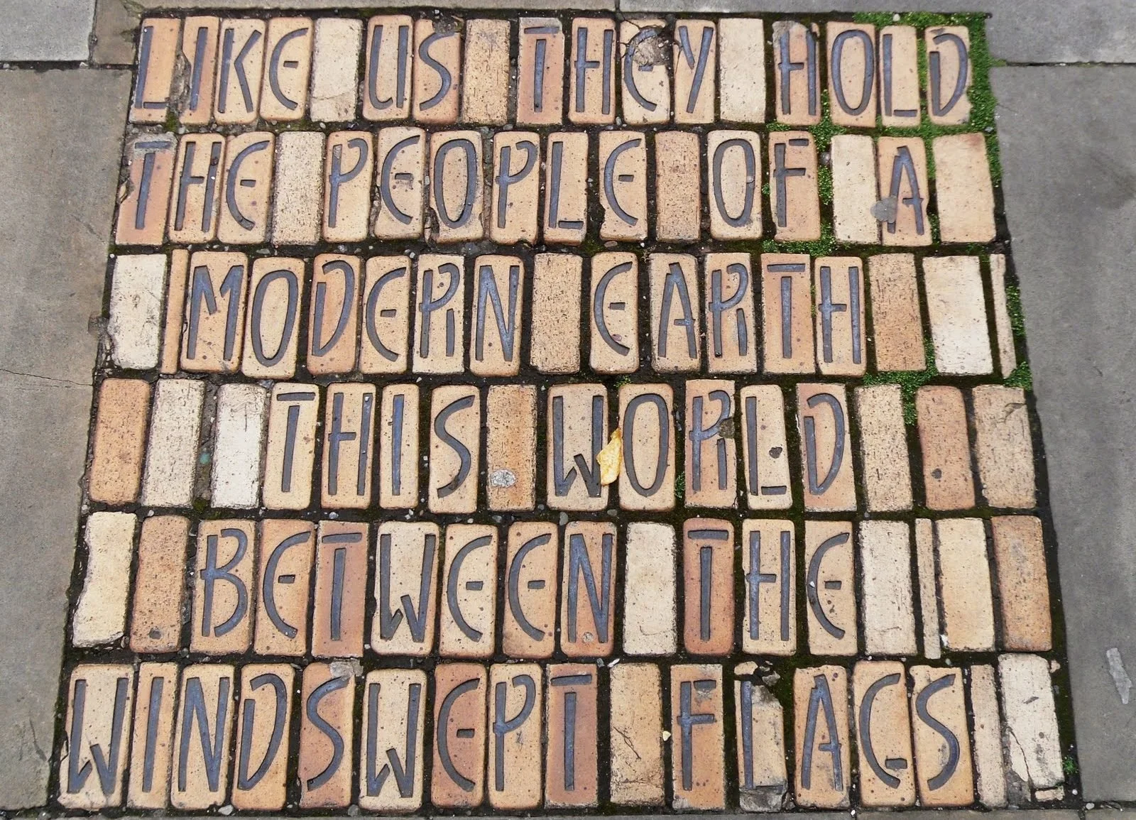 In 1998 my poem “Flags” was embedded into the pavement of Tib Street in The Northern Quarter of Central Manchester. See the photo above. The font was designed by artist Tim Rushton to give The Northern Quarter its distinctive style. Flags stretches for one mile in verses from the title page at the bottom of Tib Street to the last verse at the top. In 2021 the poem received a much needed makeover and was launched with a jubilant crowd who followed me as I read it up the street from my signature to the final verse.