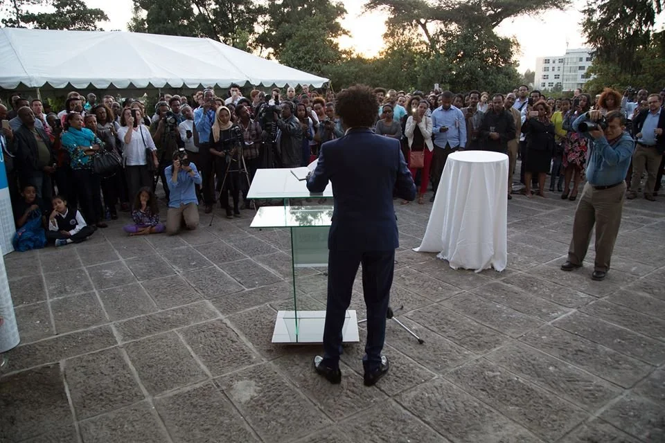 Ethiopian Airlines welcomed me to Addis with a red yellow and green bouquet of flowers in my hotel room at The Hilton.I'm here i to launch "Let There be Peace". It is the first landmark poem in Ethiopia. It is erected at The British Council in Addis Ababa. I am extremely proud of this moment in my life. All my landmark poems are here. The picture below was taken the night before the launch.The invites were resting in the homes of the people of Addis. One more sunrise to go.The next sunrise came and just before before sunset "Let There Be Peace" was launched. The event was filmed by EBS and broadcast, in part, on TV the following night.The spice girls of Ethiopia YEGNA performed their national hit. Here they are shortly after. Someone must invite these world class singers to England.I love to be with my Ethiopian audience after a performance and take as many selfies as possible - Photographed by Matt Andrea.It was all made possible through the vision of Tom Miscioscia director of The British Council in Ethiopia. I visited Perfan to deliver some laptops with my friend Meseret Fikru from The Economic Commission. It's one of my favourite places in Addis. "This is a Children's Home?" I said to one of the young people. "No this is our home" she replied.I visited the A & E kindergarden run by Azeb Alfred the sister of my magical Godmother Ethiopia Alfred.I gave a TEDx talk at Addis Ababa University to a wonderful audience.And I made new friends like the extraordinary philanthropist designer and model Anna Getaneh.And I got to be with old friends too. Here's photographer Aida Muluneh. I value our friendship more each time we meet. Aida is the most productive and also the most socially conscious photographer coming out of Ethiopia and exhibits her work around the world.My sister Wuleta is a brilliant woman and I love her.I spent 8 days in Addis (15th to 23rd November) and these are just some of the happenings. I also gave a talk with The Peace Group at University of Addis with Whitehouse Champion Semhar Araia.On the day I left I visited Professor Richard Pankhurst OBE thanks to Alula and Konjit. He is the son of Sylvia Pankhurst whowas the sister of Suffragette Christabel Pankhurst. Christabel studied at The University of Manchester. Attaining a degree in law she knew she'd be unable to practise law due to discrimination.Professor Pankhurst and I spoke of Prince Alemayhu and stolen manuscripts. I am a stolen manuscript returning my story to Ethiopia. And there are others that should also return or be returned.