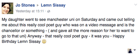 This is Subrina. She cuts my hair .The afro has gone. But it went the day before a BBC broadcast 'Portrait of.." (click pic)In which I have an Afro. The portrait is in The Foundling MuseumThis came though. These things inspire me. It's the reason I'm Chancellor: to inspire.The next day I delivered a keynote at the launch of Teach First Summer Institute. Teachers are under pressure. They need support. Teach first puts them first.I popped in to my university to see the award winning communications teamThen to see On Corporation St at HOME and hang with friend & actor Yusra Warsama.That evening I met Sally Lyndsay. Sally kindly helped The Christmas Dinner. And I had a special meeting with World Champion Geoff ThompsonKate Tempest told me about a special poet from Manchester. So I go see him at Band on The Wall in manchester. I speak at The Ramadan Tent Project on the university of Manchester campus.I am proud to be part of a university that looks like this. I REALLY am.The next day I meet The Education people to record script for an online resourceIn my role as Chancellor I chair the General Assembly of The University of Manchester.Later in the evening a speech by John McGrath the artistic director of MIF.Back to London for a day and then straight to France to a bilingual literature festival Here are three different generations each involved in a different way with my reading.I loved this french excursion. The reading was a blast. The referendum was not.And then straight back to Manchester where baggage handlers managed to ruin my bagsI spoke at The Heads Leadership conference in Cheshire. I felt inspired by them. Then straight back to London. (Flybe have telephoned and organised to pick my bag.) I gave the Keynote for Artsworks at Coin Street Neighbourhood Centre. Thanks to Murray Freestone for the photo. Then I legged it back to Manchester on the Pendellino train. This poster was on a wall.the proofs for my new and selected poems are waiting at The Malmaison HotelThe next day I wake at 5am. I'm on Breakfast TV at 8.30am in Media City.In the evening I read Listening Post at Heaton Park. You can see the gig by clicking here. On the same day TED NPR (my favourite podcast) decided to repeat my interviewI spent the weekend in Manchester writing script. On Sunday JUly 3rd BBC RadioOn July 4th I read poems at Macclesfield Academy to young people in transition week..On Tuesday July 5th I visit Sheffield and spend the day with my friend Julie Stewartat The Childrens Media Conference then I gave the keynote address: It is the UK's premier meeting place for the children's content industries.It was an audience at the top of their game at the top of their industry. Then I was taxi'd to the station and onwards:I wake the next day in a different country.July 6th is an historic day for Wales: At ten in the morning I 'm sat with fifteen young people. They suffer anxiety. I show them how to make poems. And they do.On the way home back to England I receive this. It's a limited edition. It'll be on sale soon at University of Manchester. Look out on Facebook for the link.On 7th July I am in Brighton at 10am to judge the creative future literary awards. This is a unique prize and I love it. It is for the marginalized and unheard.Then back to London to BBC to interview Linton Kwesi Johnson about Bob Marley for a BBC radio programe I am presenting.By the time I get home the insurance company make an offer and say I can use their offer to buy particular luggage. But I don't want to buy their luggage. I want mine.Each day between 5am and 10am I try to write an original morning tweet. Here are two. The one above is about Brexit and the one below is about The Somme.I know these posts are uninspiring. They are lists of what I do. I'll stop them when it's reached a year since my instalation as Chancellor at The University. Nearly there. Then I'll get back to writing blogs. Thanks. But finally.... finally honest....just a couple of days ago I received these two photographs from my childhood from a guy called Mark English - his mum actually. I am grateful. They are immediately precious to me.