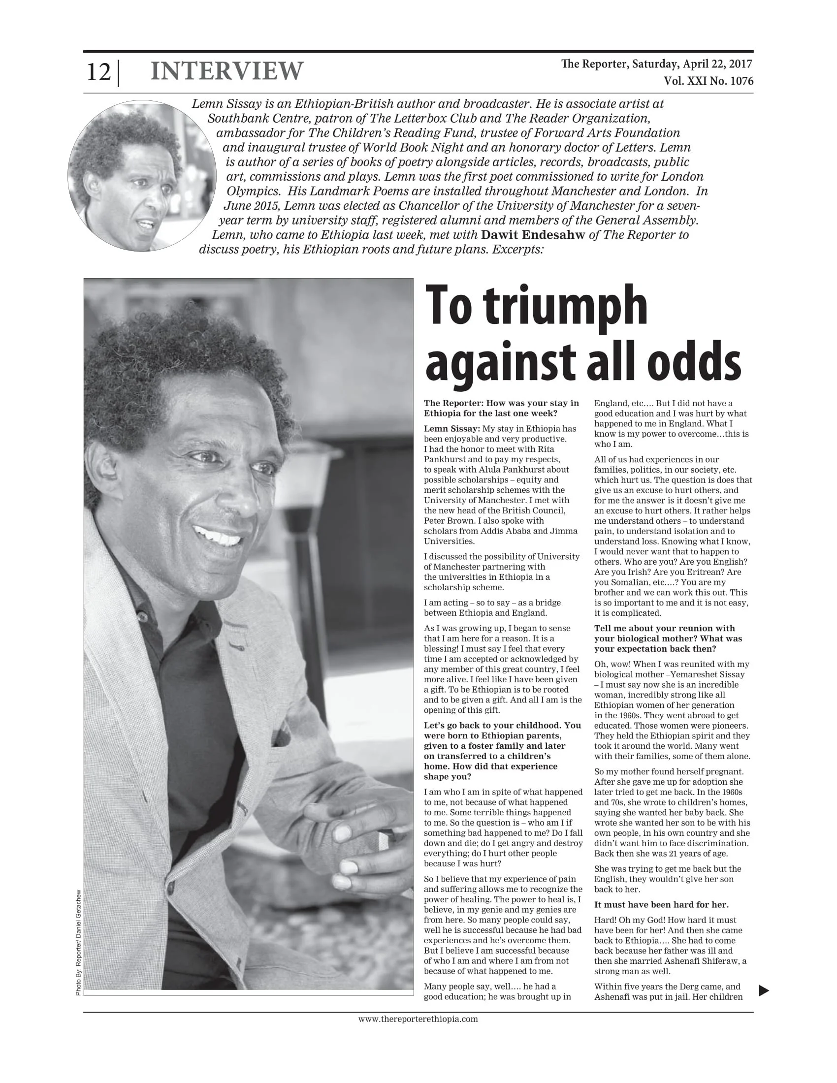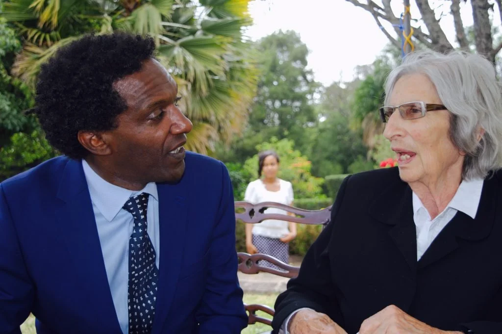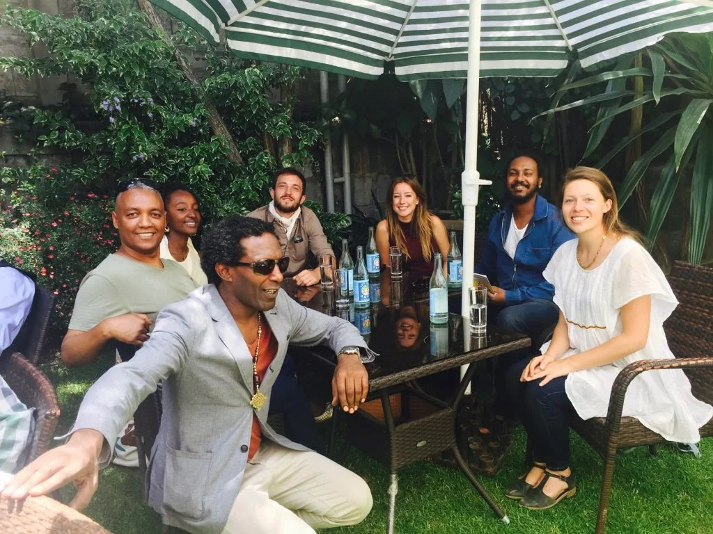 A seven hour flight on Ethiopian Airlines. I am here in Addis for four days. It's MONDAY..Meseret meets me at the airport. Meseret iis my friend from The ECA.The first thing to do is check in at The Hilton and take this picture from my room. And then to visit and pay respect to The Pankhurst family. Professor Rita Pankhurst, Helen Pankhurst and Alula Pankhurst. Here is Helen and Alula.The Hilton Hotel is a great place to meet intelligent people. This is Rebecca Araya. She's General Manager at The America Chamber of Commerce in Ethiopia.TUESDAY it's Easter celebrations. I spent the day with family. As it should be. It was all about food, food, food. And it was beautiful. The day started at 10.30am with a tradition that goes back a long long way. The man to my right is the number one vetinary surgeon in Ethiopia. He is family. The man to my left is the state minister for finance. It was an honour to spend time with them. Melkam Fasika. TUESDAY 9AM I meet Aida Muluneh the most famous living photographer in Ethiopia.She is Sony World Potography Award Judge, Director of Addis Photofest and Curator of the next Dakar Biennale. She has four exhibitions opening in France. And others in US. On reflection I prefer this picture. Aida and I are determined to work together. I am honoured that she allowed her photograoh (of me) to be printed in my book. In the afternoon at a Dashenl restaurant in Addis my friend Aster Zaoude threw a welcome party for me. At this table from left to right Mr and Mrs Tadesse, Bernie, Anna, Marcos (ICEADDIS) , and Sally Duncan. They are all some kind of amazing. The picture below is everyone. Thankyou Dashen restaurant. Here there is a supermodel, doctors, lawyers, singers, academics and a princess.Most of all thankyou Aster Zaoude. Thankyou for everyting. Aster is the cool woman on my right. On my left is Anna Getaneh. I'll tell you more about Anna later.TUESDAY: I am guest of honour at The Queens Birthday Partyat The British Embassy. We are celebrating the strong relationship between Ethiopia and Britain. There are hundreds of dignitaries dressed in all their finery. The speech by ambassador Sussanna Moorehead has me in awe. Before inviting me on stage (to speak) she says "we have a surprise for you Lemn" and The Scots Royal Guards who were stood behind me stepped forwrard and played Amazing Grace on the bagpipes. If you have heard Desert Island Discs you will know what this meant to me. I wept.Public tears. Very unbritish.Very unethiopian. Then I walked to the podium and spoke.And thenI spoke some more. In my speechI link the Queens Birthday with the nature of family. And the nature of family with Ethiopian and British relations.It is difficult to explain how much it means to be guest of honor at The British Embassy in Addis Ababa. I dedicate my speech to Rita Pankhurst and her late husband Professor Richard Pankhurst.The Ethiopian singer Munit Mesfin was at The Embassy too. Hear her beautiful music.It was a pleasure to meet Dr Eleni Zaude Gabre-Madhin. Eleni is an Ethiopian economist and a former Chief Executive Officer of the Ethiopia Commodity Exchange (ECX).WEDNESDAY 9AM. I had the honour of an audience with The President of Addis Ababa University Professor . Admasu Tsegaye.He also invited Professor Tassew Woldehanna, President of research and technology Transfer and Professor Bekele Gutema of The Department of Philosophy and Director of Graduate ProgramsAt 10am I am whisked off to meet Peter Brown. He is the new head of The British Council Ethiopia. It is a kind coincidence that Peter was at The Ugandan British Council from where he brokered The Equity and Merit scholarship scheme with University of Manchester.There were a couple of lessons going on inside The British Council so I popped in for an improptu chat with the studentsand another class asked for a pic outside. I'm always happy for a photo. Then at 2pm back at the hotel it was my first time to sim in naturally heated spring water.But as I exit the pool a reporter called Dawit called in from The reporterMeanwhile my friend Anna Chojnicka was in Captial newspaper talking of her NGO - Reach for Change. It is 99 percent Ethiopiain workers. it is a good place. A good NGO.Then for a meal at Yehsi's house. I coud feel the passages of timein her home. Yeshi owns Tila which is a beautiful gym and spar. Yeshi is really close to my family.Back at The Hilton hotel I meet the Ethiopians who came to my Uganda event a month ago. . They gave me the picture below which was taken in Kampala. Talking of gifts. This next one is precious too. It was given to me today by a princess of His Imperial Majesty Haile Selassie. The princess heard me talking of the tatoo of a cross on my hand. I did it myself with Indian ink when I was 14. I did not know I was Ethiopian. A generation of Ethiopian women tatoo themselves too. Today I received this.This is Selam. She manages Tila. Yeshi is her aunt.THURSDAY: I'm leaving today. I've done many more things than in this blog. while I have been here. I met professor Abebe Zegeye to discuss astronomy developments in unviersities in Ehiopia. I met Architect Fasil Giorghis an expert in Urban Planning Below is Bewketu Seyoum. He is the most famous living young writer in Ethiopia. He is an academic an his readers are the entire country.Below is Ephrem Seyoum. He has translated thirty of my poems into Amharic.I also met the pilot Yonas MeKcuria . He fought hijackers then landed this plane.He is a national hero and I am making a BBC radio Documentary with him. he called up to my room at 7am having flown in from Bejing this morning.."Each time I fly I whisper to the engines. I become one with the plane." He is everything you would imagine a true pilot to be. It is an inspiring meeting with a magnificent man". At 2pm I meet another incredible. The supermodel philanthropist Anna Getaneh.I had the leasure of visiting her new store - African Mosaique. It's beautiful.And so it is time to check out of The H