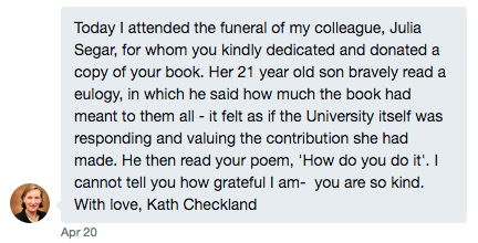 This blog is about two women and one date. April 20th. I've written it to hold memory in the amber of cyberspace. I've been meaning to write it since that date.Katherine worked at The University of Manchester and so did Julie Segar. . Julie had voted for me to become Chancellor. She was dying and requested a particular poem signed by me. It was this one"How do you do it?" said night"How do you wake and shine?""I keep it simple" said light"One day at a time".I offered "Gold From The Stone" because this is the first peice in it. I said I could drop the book off at The Malmaison hotel in Manchester in a couple of days. I took the book from my lodgings in London to Manchester and Kath duly picked it up and took it to her bedbound colleague. I then set off for Ethiopia. I returned on 20th April and switched on my phone. A new message.Let's go back again just before I left for Ethiopia. A message from a woman I love. I don't know why but from the moment I met Rebecca Swift I knew we'd be friends for life. It's rare this happens in life. Here are her words. She too was dying.On returning from Ethiopia. At the same moment on April 20th (when I switched my phone on as the plane landed at Heathrow) I read this message from Rebecca's dear partner. I couldn't make the funeral. But I was at 20th Anniversary of The Literary Consultancy a few weeks earlier.The acronym of The Literary Consultancy says everything about Rebecca. I was sat next to where this picture was taken.I carry her book with me everywhere I go. I have it here now.Of this I am sure: life is not worth living if there is noone you would die for.