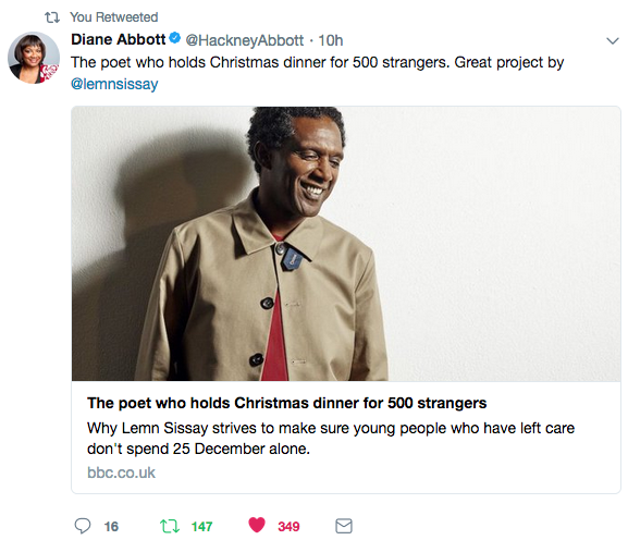 It could be said, family is a group of people constantly proving that each other exists. It could be said, family is a collection of memories disputed between one group of people over a lifetime. I blog in lieu of these (questionable) priviliges. Here are the past four days.Tuesday 19th December. The plane arrives at Addis Aaba Airport. By early evening Iām at a party in (the aptly named) Sapphire Hotel to celebrate the return (from Sweden) of Yetnerbesh Nigussie. Yetnerbesh is a blind Ethiopian lawyer and champion of disabled people around the world. She has just won the Light for The World award known as The Alternative Nobel Prize. The speech by The Swedish Ambassador (in photo) was deeply moving and inspiring.On leaving this historic event the greatest living pianist of Ethiopia girma yifrashewa played an impromptu set in the hotel lobby for Yetnerbesh. Wednesday morning 19th December: by 6am I am on top of a mountain with Joanne Jacobs and David Gennard of University of Manchester. It is called Entoto and from here see Addis Ababa. David is filming me for The Equity and Merit Scholarship.The Addis Standard newspaper features an interview from my previous visit. And then to the British Council for a meeting. This is Mahlet and me.[video width="638" height="360" mp4="https://blog.lemnsissay.com/wordpress/wp-content/uploads/2017/12/british-council.mp4"][/video]At 5.30pm I'm at The official launch The Equity and Merit Scholarship at The British Ambassadors residence. Thanks to the British Ambassador and to The British Council. I am proud of my university and say as much on National Television (EBS) .My friend Mulatu Astatke came. He's the most famous living musician in Ethiopia.We hatch plans to work together And my dear friends Alula and Helen Pankhurst came too. The Pankhurst family live in Ethiopia. 2018 will be the year of The Pankhursts!Late Wednesday night I catch the plane back to London on Ethiopian AirlinesI arrive on in London on Thursday 20th December . On Friday 19th DecemberThe Christmas Dinners feature on The BBC News Homepage. Click photo for article. Also today the volunteers of The Christmas Dinner feature in The Guardian. Also today I'm interviewed on BBC Radio Five Live about the Christmas Dinner. And on ITV news. The Christmas Dinners are catching the imagination of the public. It's now Friday night. If you would like to put on a Christams Dinner for care leavers next year download The How To Guide by clicking belowTomorrow I travel to Manchester for Christmas thanks to an electric steering group who have been meeting since September to put on a Christmas Dinner in Manchester. Things that might surprise you? I guess it might surprise you how many race-hate tweets I received today. You'll never know the daily online attacks on MP Diane Abbott. We face darkness with light. On 19th December i wrote this.